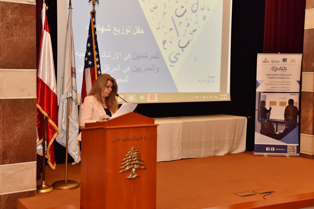 رعى وزير التربية والتعليم العالي مروان حماده حفل توزيع الشهادات للمرشدين في جهاز الإرشاد والتوجيه وللمدربين في المركز التربوي للبحوث والإنماء الذين تابعوا دورات تدريبية على تفعيل دور التكنولوجيا في التعليم ضمن مشروع QITABI الممول من الوكالة الأميركية للتنمية الدولية، تقديراً لجهودهم والتزامهم في البرنامج التدريبي، وذلك في احتفال أقيم في وزارة التربية بحضور مديرة الوكالة الأميركية للتنمية الدولية في بيروت الدكتورة آن باترسون ورئيسة المركز التربوي للبحوث والإنماء الدكتورة ندى عويجان والمدير العام للتربية فادي يرق، ومديرة مشروع QITABI بوليت عساف، ومنسقة الهيئة الأكاديمية المشتركة في المركز التربوي رنا عبدالله ، ومديرة الإرشاد والتوجيه والإمتحانات هيلدا الخوري والإختصاصية التربوية في الوكالة زينة سلامة، ومدير قسم التربية في الوكالة بروس ماكفارلن، ومديرة مكتب وورلد ليرننغ في لبنان د. وفاء قطب، ومستشارة الوزير الدكتورة جنان شعبان، ورئيسة جمعية اميديست باربرا بتلوني والمستشار الإعلامي ألبير شمعون وجمع من كبار موظفي الوزارة والمركز التربوي.