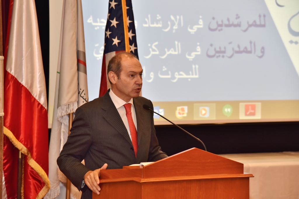 إنكم مجموعة مختارة من مدربي مكتب الإعداد والتدريب وملحقي الاقسام الاكاديمية المشتركة في المركز التربوي ومن مرشدي جهاز الإرشاد والتوجيه في المديريّة العامة للتربية، تابعتم الدورات وتعززت خبراتكم، وسوف تحصل انعكاساتَها الإيجابية، ان شاء الله، من خلالكم في، أداء الأساتذة والمعلمين في المدارس الرسمية. أنتم عصب كل تجديد وتقدّم وتحديث، وإن إنخراطكم بكل جدية واندفاع في مرحلة التحوّل نحو التربية والتعليم التفاعلي، يجعل الآمال بنجاح ورشة تطوير المناهج أكبر. فأنتم نخبة المجتمع وجسر العبور الى التطور والتغيير. وأنتم من نأتمنه تنشأة أولادنِا وتأهيَلهم ليعبروا سلك الحياة متسلحين بالمعرفة والمنطق والانتماء للوطن محافظين على المنطلقات الأساسية في العلاقات الانسانيّة والتنمية المستدامة.