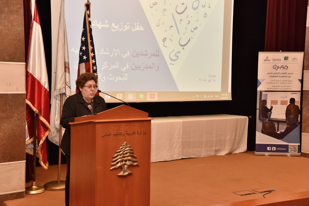 إنها مناسبة لتوجيه الشكر والتقدير إلى راعي الحفل، معالي وزير التربية والتعليم العالي الاستاذ مروان حمادة، والى الوكالة الأميركية للتنمية الدولية بشخص مديرتها في بيروت السيدة آن باترسون وإلى مشروع QITABI ومديرتَه السيدة بوليت عساف، وإلى فريق العمل في المركز التربوي للبحوث والانماء والمديريّة العامة للتربية، لكل الجهود المبذولة لانجاح هذه الورشة الوطنية وما سبقَها. وإلى المزيد من التطوير والتحديث والعصرنة في المضمون والطرائق، لنرفع مستوى التعليم في كل لبنان.